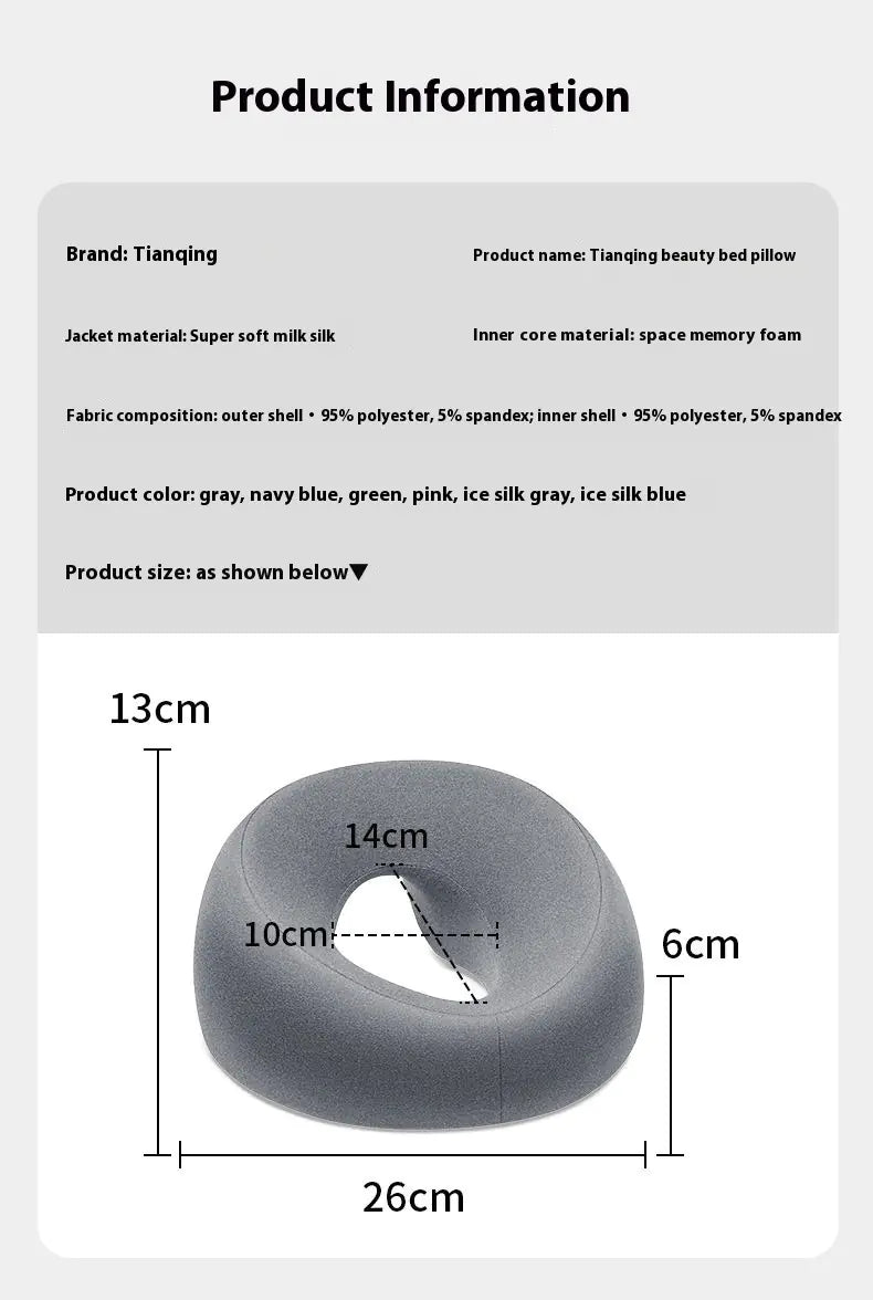 Ergonomic O-type memory foam pillow designed for face-down massage or spa use. Comfortably supports the face, suitable for home or professional massage tables. Material: Memory foam.
